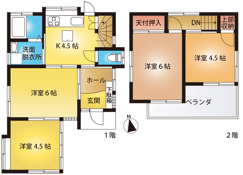 | 間取内容 | 洋室 4.5畳 1階 1室 洋室 6畳 1階 1室 K 4.5畳 1階 1室 洋室 4.5畳 2階 1室 洋室 6畳 2階 1室 | ||